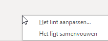 Indien in het lint van Outlook het tabblad “Ontwikkelaars” niet aanwezig is, gaan we deze eerst toevoegen. Dit doe je door helemaal rechts in het lint met je rechtermuisknop te klikken. Er opent zich dan een menu met 2 opties. Klik op de optie “Het lint aanpassen…”.